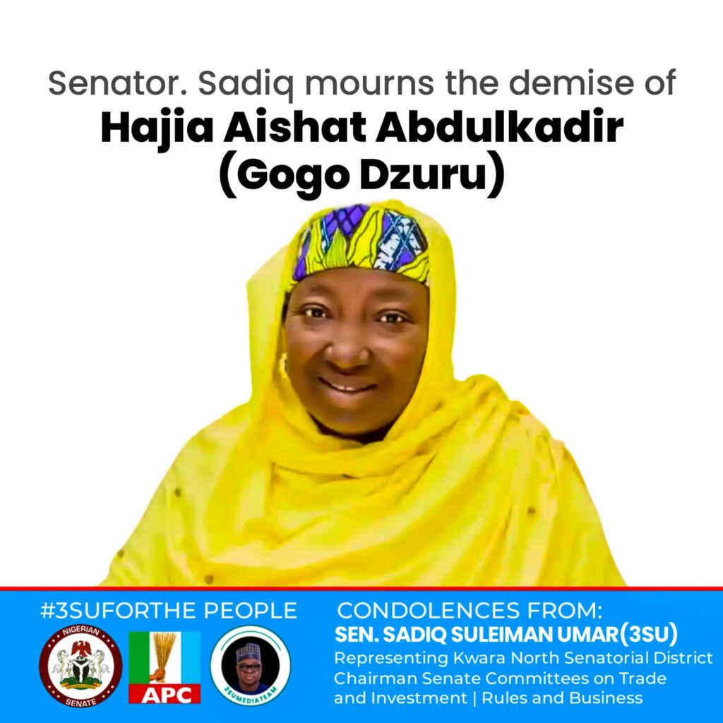 Senator Sadiq Suleiman Umar, representing Kwara North Senatorial District, has extended his heartfelt condolences to Alhaji Abdulkadir Attahiru Nma-nko, an elder statesman in Patigi and Kwara State at large, over the passing of his beloved wife, Hajia Aishat Abdulkadir (Gogo Dzuru).
