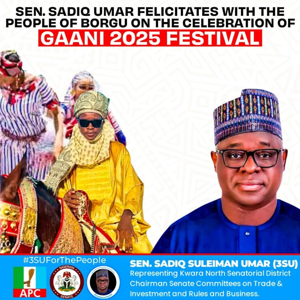 The Distinguished Senator representing Kwara North Senatorial District, Senator Sadiq Suleiman Umar, has extended his heartfelt felicitations to the revered Royal Fathers of Kaiama and Yashikira, His Royal Highness, Alhaji Muazu Omar Bagidi Kiyaru IV, the Emir of Kaiama and Alh. Dr. Ambassador Usman Sariki Umar. The Sabikpasi II, the Emir of Yashikira on the celebration of the historic 2025 Gaani Festival held on Saturday, 13th September 2025.