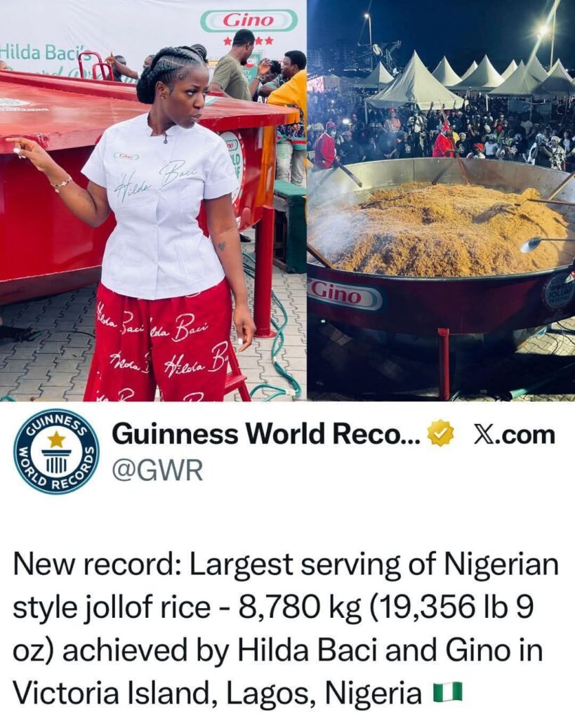 The post read: “New record: Largest serving of Nigerian-style jollof rice – 8,780 kg (19,356 lb 9 oz) achieved by Hilda Baci and Gino in Victoria Island, Lagos, Nigeria 🇳🇬.”