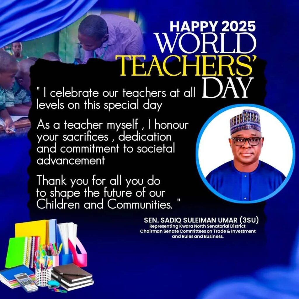 The Senator representing Kwara North Senatorial District, Senator Sadiq Suleiman Umar, has joined His Excellency Gov. Abdulrahman Abdulrazaq CON (Executive Governor of Kwara State) and millions around the world to celebrate the invaluable contributions of teachers to nation-building on the occasion of World Teachers’ Day 2025.