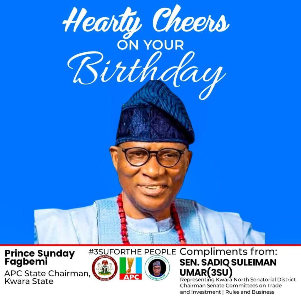 Senator Sadiq Suleiman Umar (3SU), representing Kwara North Senatorial District and Chairman, Senate Committees on Trade and Investment as well as Rules and Business, has extended warm felicitations to the Chairman of the All Progressives Congress (APC), Kwara State Chapter, Prince Sunday Fagbemi, on the occasion of his birthday anniversary.