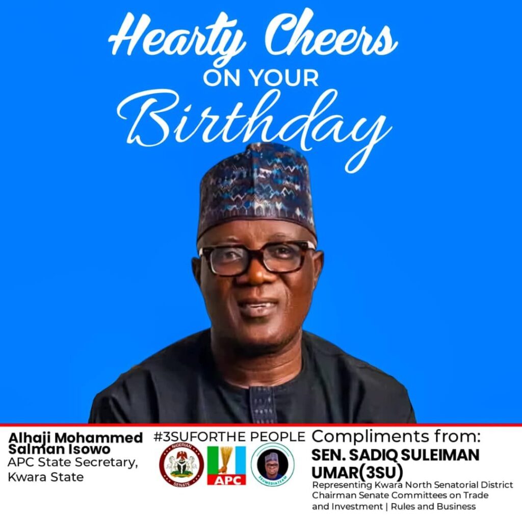 Distinguished Senator Sadiq Suleiman Umar (Kwara North) joins the entire APC family across Kwara in celebrating our dependable State Secretary, Alhaji Mohammed Mustapha Salman Isowo, on his 70th birthday.