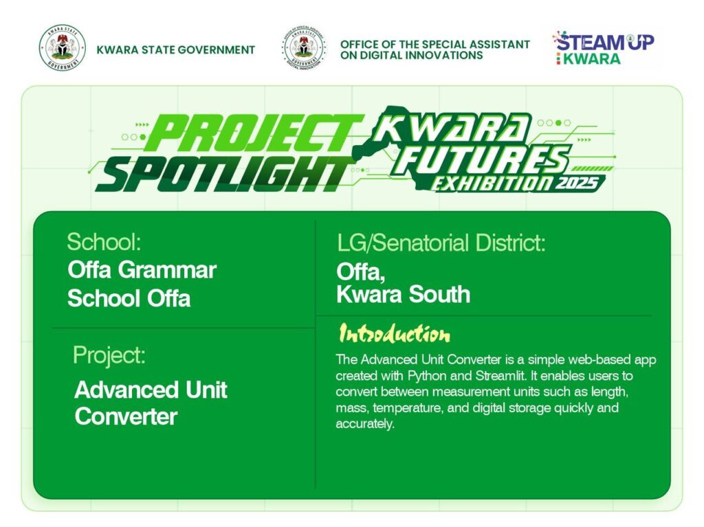 The highly anticipated Kwara Futures Exhibition, holding on Wednesday, October 29, 2025, at the Kwara State Banquet Hall, will spotlight groundbreaking innovations developed by students of the Kwara Coding and Digital Literacy Programme.