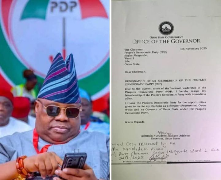 The Governor of Osun State, Senator Ademola Nurudeen Jackson Adeleke, has resigned his membership from the People’s Democratic Party (PDP), effective immediately.