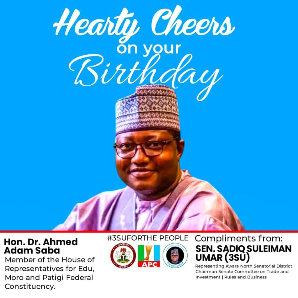 The Senator representing Kwara North Senatorial District, Sen. Sadiq Suleiman Umar (3SU), extends warm birthday felicitations to Hon. Dr. Ahmed Adam Saba, Member of the House of Representatives for Edu, Moro and Patigi Federal Constituency as he marks his birthday anniversary.