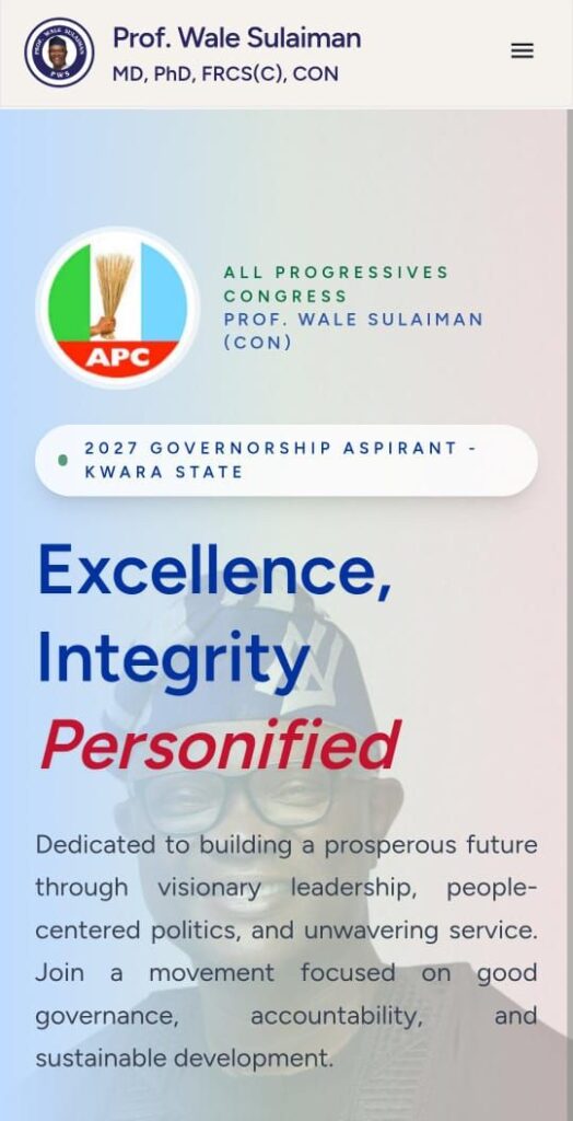 The platform specifically highlights two of the Professor Sulaiman’s core pillars. which are Healthcare Reform, leveraging his status as a global citizen and world-class medical expert to champion universal health coverage and qualitative medical delivery, and Youth Empowerment, focusing on the Digital Economy in Kwara State, the site outlines plans to create opportunities that ensure Kwara’s youth can compete in the 21st-century global market.