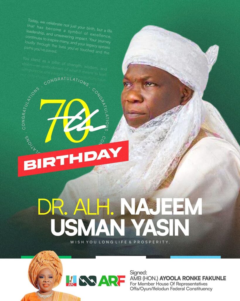 A stalwart of the All Progressives Congress (APC) and 2027 House of Representatives hopeful for Ifelodun/Offa/Oyun federal constituency, Amb (Hon.) Ayoola Ronke Fakunle, has warmly felicitated with elder statesman, Alhaji Najeemdeen Usman Yasin, on the occasion of his 70th birthday anniversary today, Wednesday, April 15, 2026.