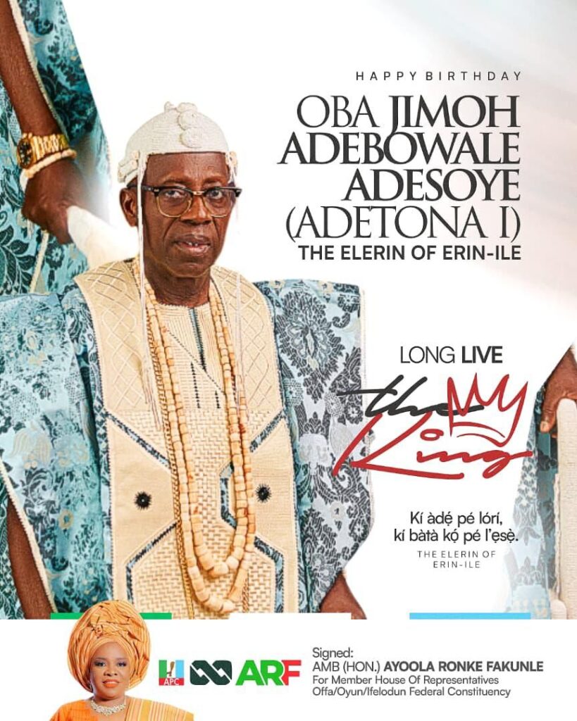 A House of Representatives hopeful for Ifelodun/Offa/Oyun federal constituency, Amb. (Hon.) Ayoola Ronke Fakunle, has extended warm felicitations to the Elerin of Erin-Ile, His Royal Majesty, Oba Jimoh Adebowale Adesoye, on the occasion of his birthday anniversary.