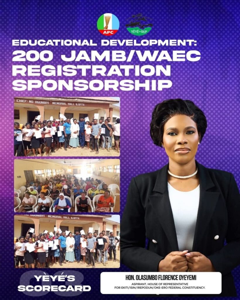 Sponsoring 200 JAMB and WAEC registrations goes beyond mere charity; it represents a strategic investment in the future. As Hon. Olasumbo Florence Oyeyemi pursues her goal of representing the wonderful people of Ekiti/Isin/Irepodun/Oke-Ero Federal Constituency in the House of Representatives, this initiative highlights her commitment to service, youth empowerment, and sustainable development.